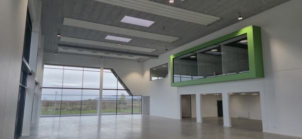 Resultatet er et lyst og funktionelt domicil, hvor designet skaber en naturlig gennemsigtighed mellem showroom og administration. De store glaspartier vender mod motorvejen og giver bygningen et markant og moderne udtryk.
