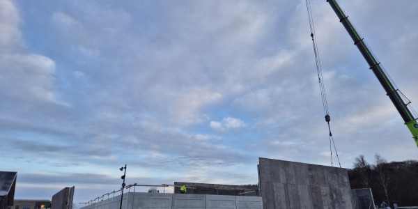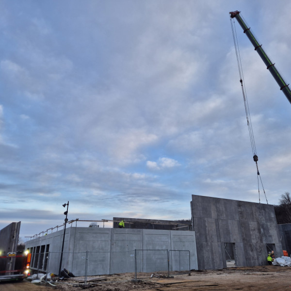På den nye idrætshal ved Frederiksværk Skole er vi nået til endnu en vigtig fase, hvor elementmontagen netop er i gang. Elementerne leveres af Heidelberg Materials Precast Denmark A/S, mens dan-con elementmontage ApS...