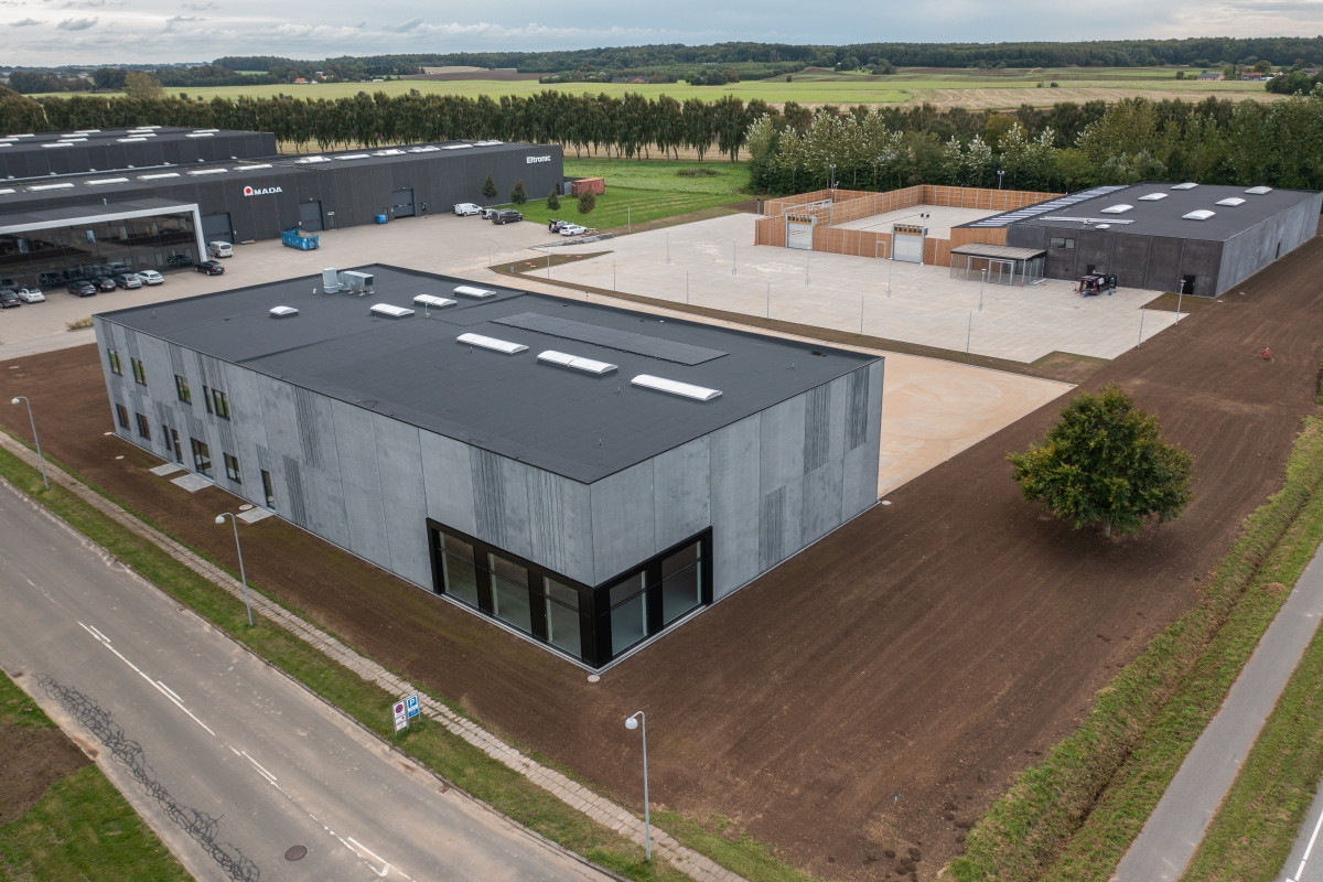 Til Amada har vi afleveret et nyt domicil, der indeholder kontor, montagehal og showroom. Ved projekteringen af bygningen har der været fokus på gennemsigtighed. Der er derfor etableret vinduer og glas brandpartier i både facader og indvendige vægge for at opnå en naturlig sammenhæng mellem funktionerne i huset.