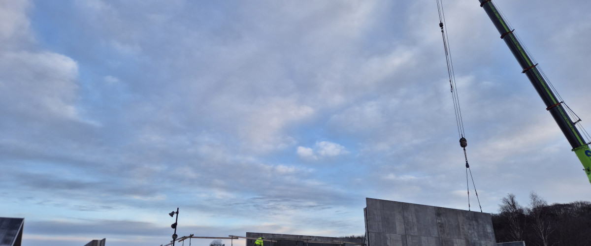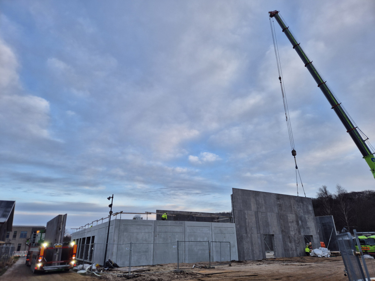 På den nye idrætshal ved Frederiksværk Skole er vi nået til endnu en vigtig fase, hvor elementmontagen netop er i gang. Elementerne leveres af Heidelberg Materials Precast Denmark A/S, mens dan-con elementmontage ApS står for montagen.