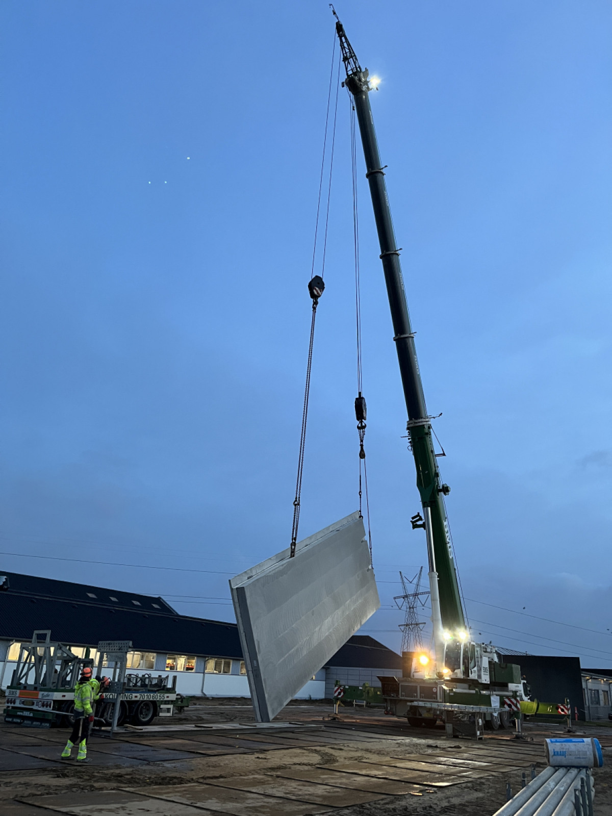 I morges startede vi elementmontagen på CK Johansen-projektet i Horsens, hvor BASE Erhverv opfører en ny lagerhal. Med 52 sandwichelementer og 10 tagplader udgør elementerne i alt 1.173 ton.