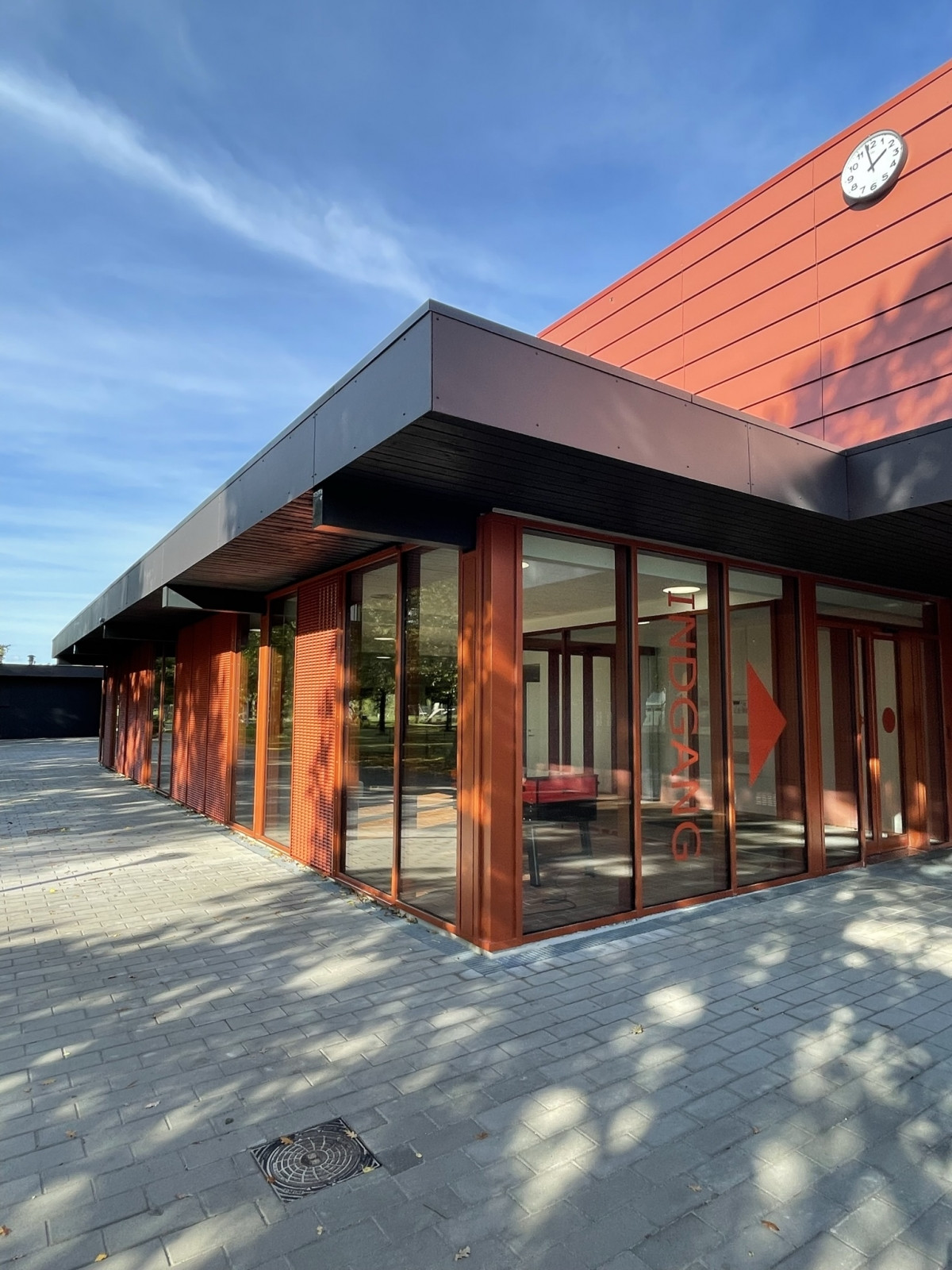 Det eksisterende halkompleks er opført i røde teglsten forbundet af gangarealer med glaspartier. Den nye multihal indpasses i omgivelserne med dens beklædning af rødlige fibercementplader monteret på klink. Foyeren, som kobles til de eksisterende gangarealer, opføres i glas-partier med rødlige profiler, hvilket skaber udkig til de udendørs grønne og beplantede arealer.