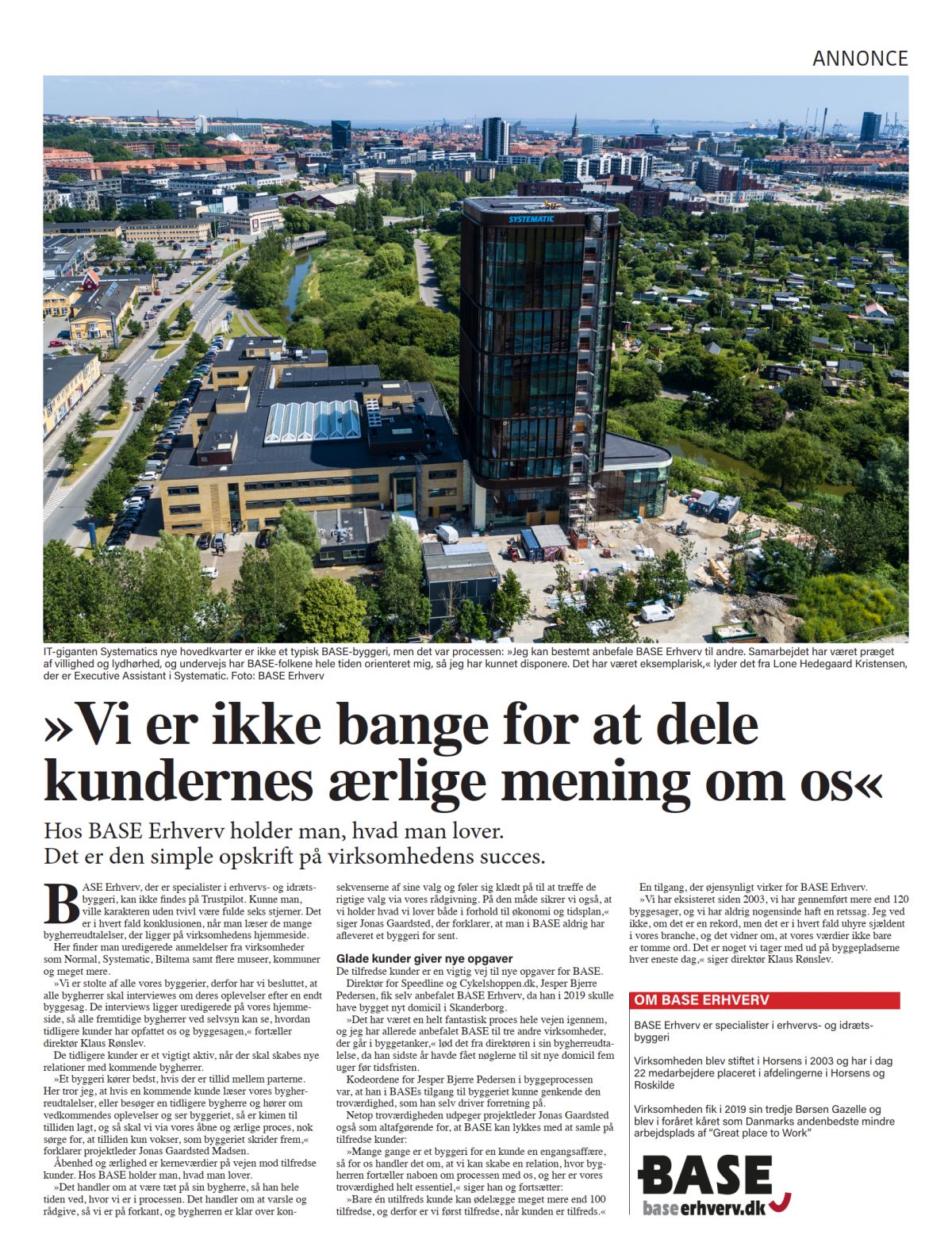 »Det har været en helt fantastisk proces hele vejen igennem, og jeg har allerede anbefalet BASE til tre andre virksomheder, der går i byggetanker,« lød det fra direktøren i sin bygherreudtalelse, da han sidste år havde fået nøglerne til sit nye domicil fem uger før tidsfristen.