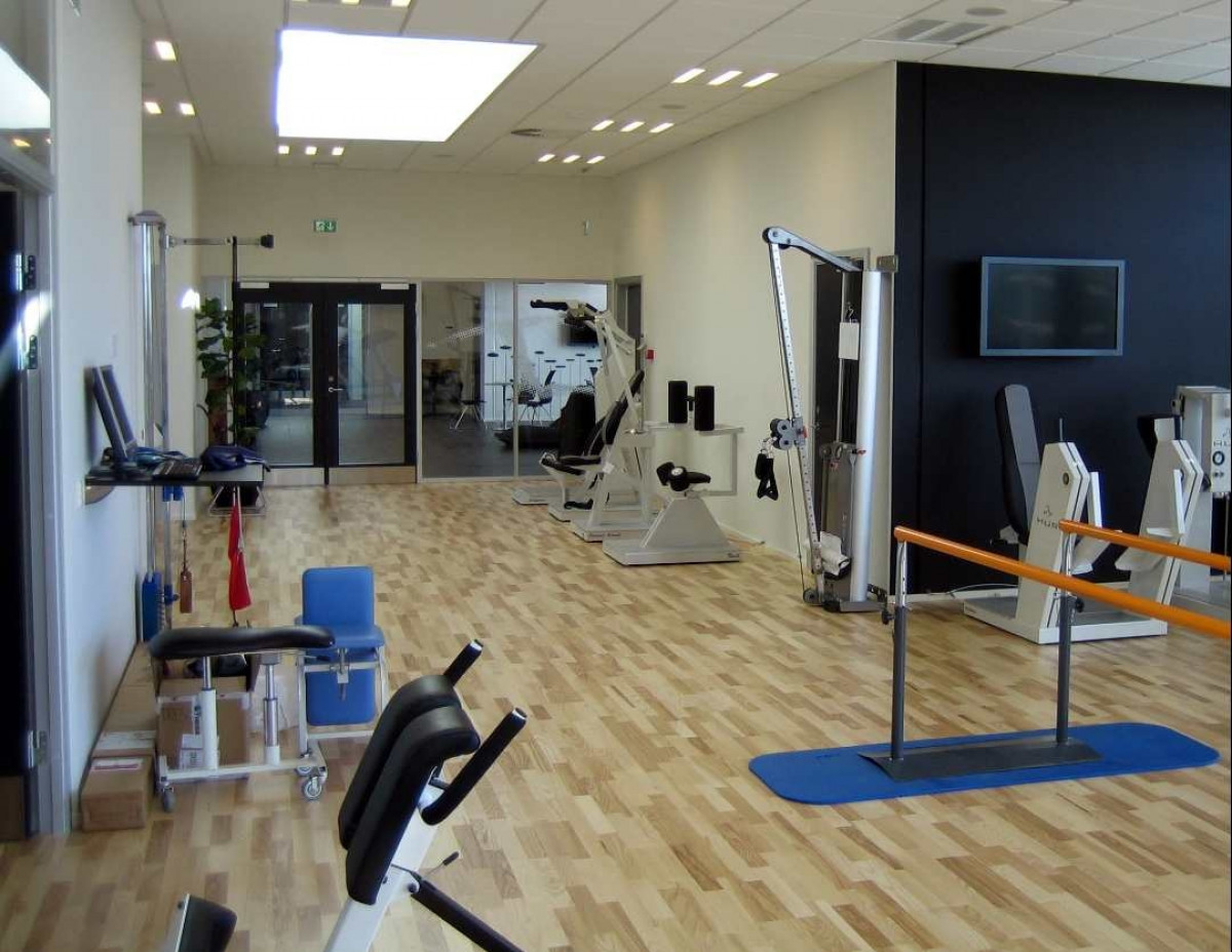 Erhvervsbyggeriet omfatter behandlerrum, kontorer, omklædnings- og toiletrum, reception, træningssale o.l.