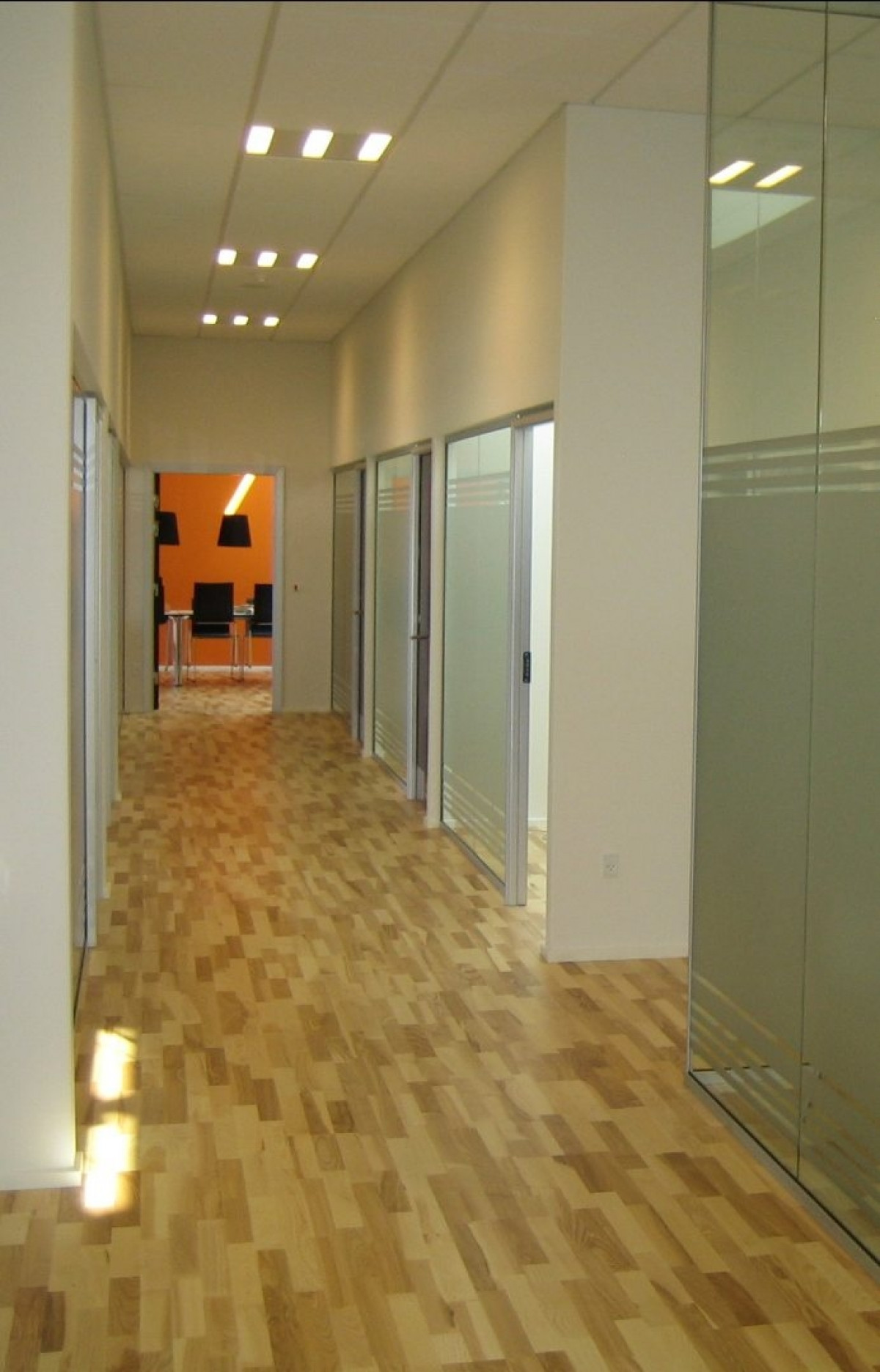 En stor del af de indvendige vægge er udført som glasskillevægge for at opnå åbenhed og lyse lokaler.