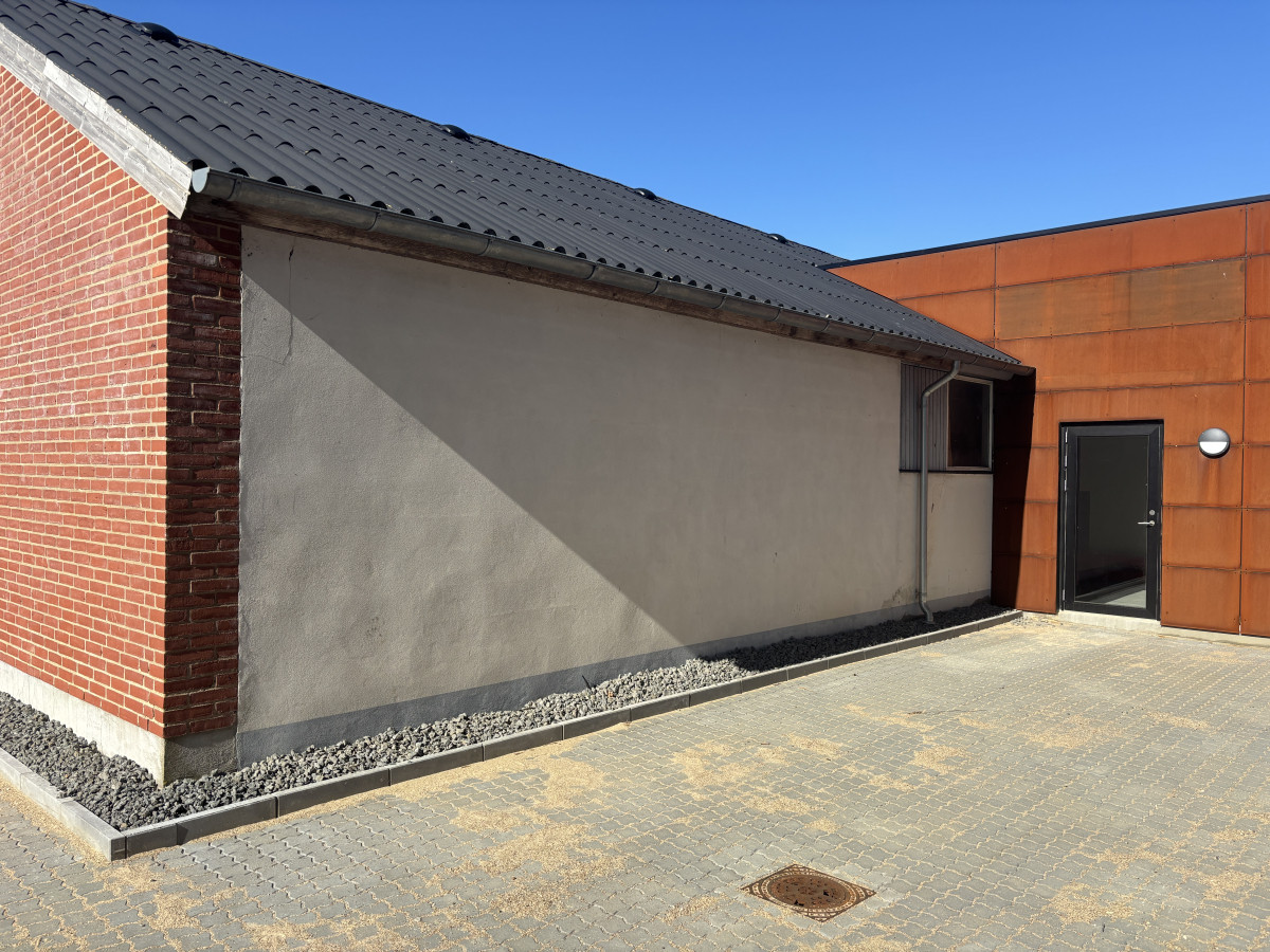 - Murstensfacader og pudsede facader beklædes med Steni facadebeklædning i varierende pladebredder, så udtrykket harmonerer med betonelementerne på den nye lagerbygning.