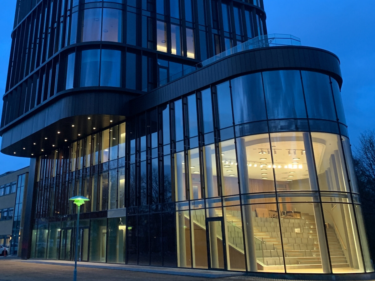 I de tre nederste etager er bygningen opført med en sidebygning, der indeholder fællessal med amfi.