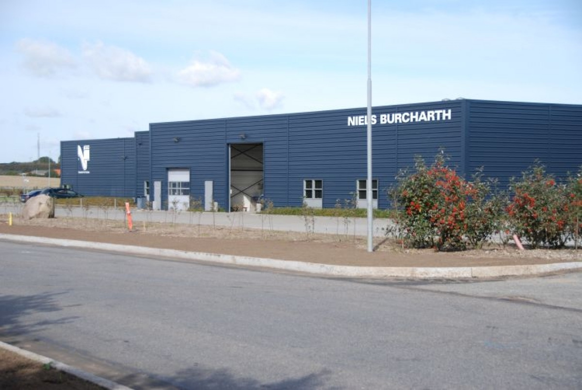 For Niels Burcharth har BASE som totalentreprenør udvidet lageret til eksisterende erhvervsbygninger. I en mindre del af lageret er der indrettet værksted. Erhvervsbyggeriet er opført som stålrammehal, med isolerede stålkassetter i facader, afsluttet med stålbeklædning. Etageareal i alt ca. 900 m2. Der er udført ca. 1.000 m2 betonstensbelægning herunder tilkørselsrampe til portsluse.