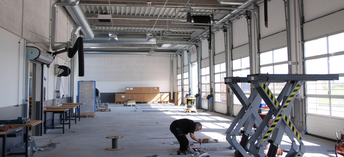 Servicecentret består af værksteder, lastvogns- og personvognsafdeling, dæklager, administration og ekspedition samt personalefaciliteter i nyt kontorbyggeri.